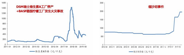 但维生素在饲料成本中占比极低,每吨猪饲料的添加量大约6g。维生素使用过量会引起饲养动物中毒,其用量有相关规范,每一种维生素都有相应推荐是用来。由于占比低,维生素占饲料成本低,下游对维生素饲料产品价格变动相对不敏感,因此价格波动区间较大,价格弹性和涨价空间都很可观。