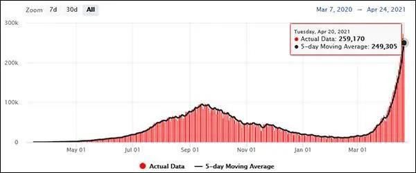 截止目前,印度已经连续五天刷新全球单日单个国家新增病例最高记录。印度政府25日预测,该国这一波新冠疫情可能于5月中旬达到峰值,届时每天新增确诊病例将高达50万例。