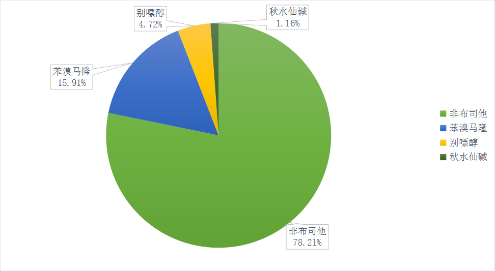 其中,非布司他以78.21%的市场份额遥遥领先,苯溴马隆占15.91%、别嘌醇占4.72%、秋水仙碱占1.16%的份额。