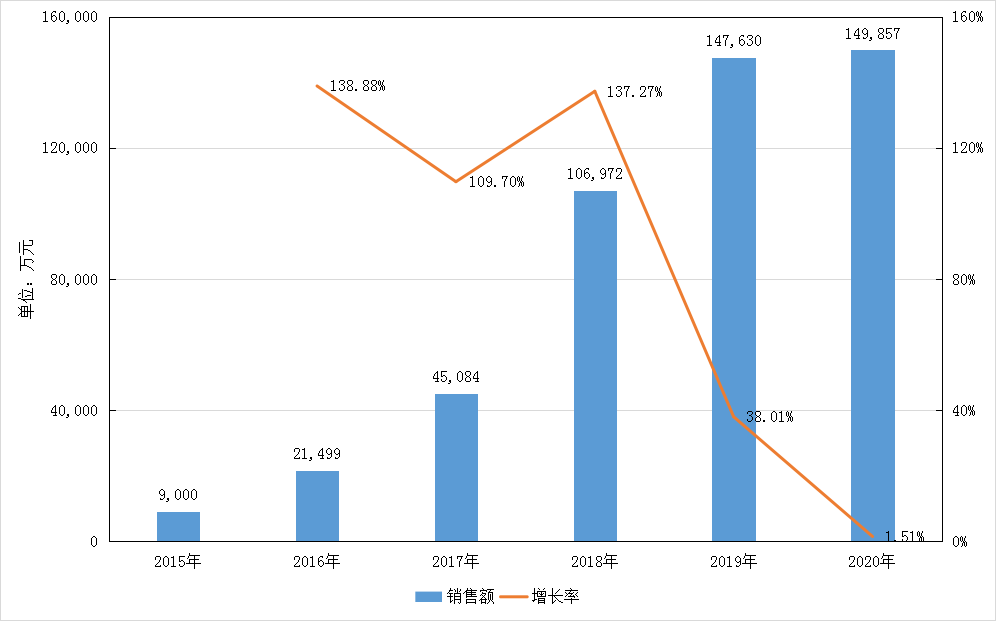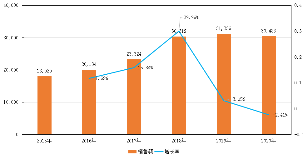 图6 2015-2020年我国公立医疗机构苯溴马隆销售额和增长率