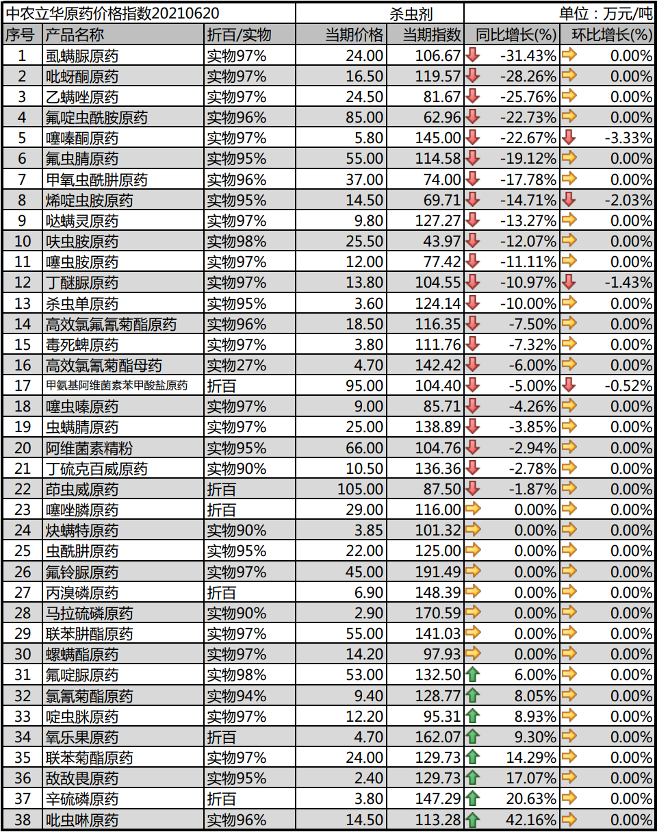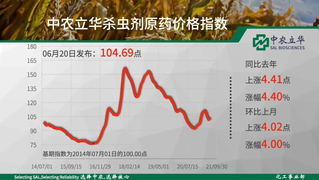 2021年06月20日中农立华杀虫剂原药价格指数报104.69点,环比上月大幅上涨4.00%。上涨:氯氰菊酯原药、联苯菊酯原药、敌敌畏原药、氧乐果原药、吡虫啉原药、氟啶脲原药、辛硫磷原药、啶虫脒原药等持平:噻唑膦原药、炔螨特原药、虫酰肼原药、氟铃脲原药、丙溴磷原药、马拉硫磷原药、联苯肼酯原药、螺螨酯原药等下跌:噻嗪酮原药、烯啶虫胺原药、丁醚脲原药、甲氨基阿维菌素苯甲酸盐原药等 //05//杀菌剂和中间体