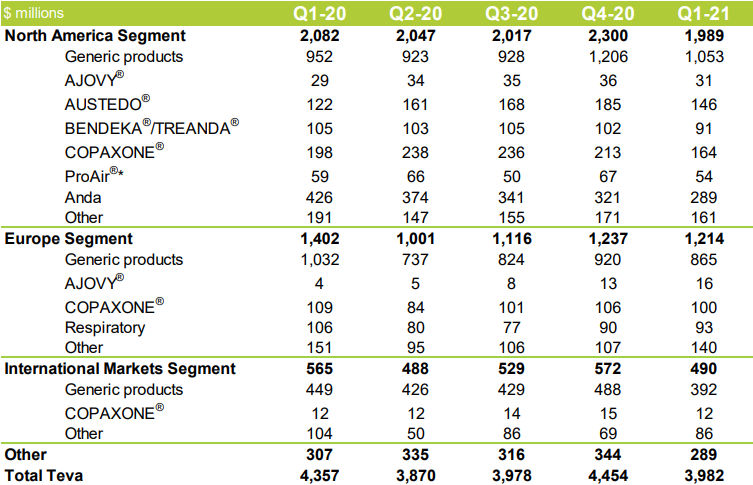 这主要是由于梯瓦欧洲分部的非专利产品、非处方药和呼吸道产品以及多发性硬化症药物Copaxone(醋酸格拉替雷注射剂)的收入减少;北美分部的Copaxone(醋酸格拉替雷注射剂)和BENDEKA/TREANDA(盐酸苯达莫司汀)的收入减少;梯瓦在日本的的大部分非专利和运营资产被剥离,以及在日本的专利产品的监管价格下降和仿制药竞争,也影响了梯瓦在日本的业务,但这部分被北美分部的非专利产品和亨廷顿治疗药物AUSTEDO(氘代丁苯那嗪)收入的增加所抵消。此外,第一季度收入也受到新冠肺炎大流行影响,导致的某些产品需求产生变化。按活动和地理区域划分,具体产品业绩如下: