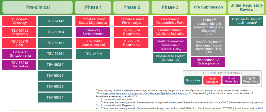 为了应对仿制药的激烈竞争,梯瓦也在布局创新药物的研发,例如,梯瓦与再生元共同开发的Fasinumab(法司努单抗),该药是一种人源化的神经生长因子(NGF)单克隆抗体,用于治疗骨关节炎疼痛,目前正处于Ⅲ期临床试验。
