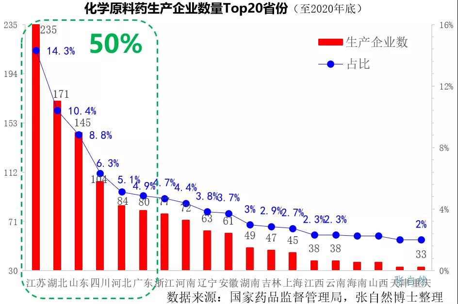 截至2020年底,我国共有化学原料药生产企业1642家,其中原料药生产企业最多的是江苏省,共有235家,占全国的14.3%;其后是湖北、山东、四川、河北和广东,分别有171家、145家、104家、84家和80家,上述6省共有819家原料药生产企业,占到全国化学原料药生产企业的半壁江山。