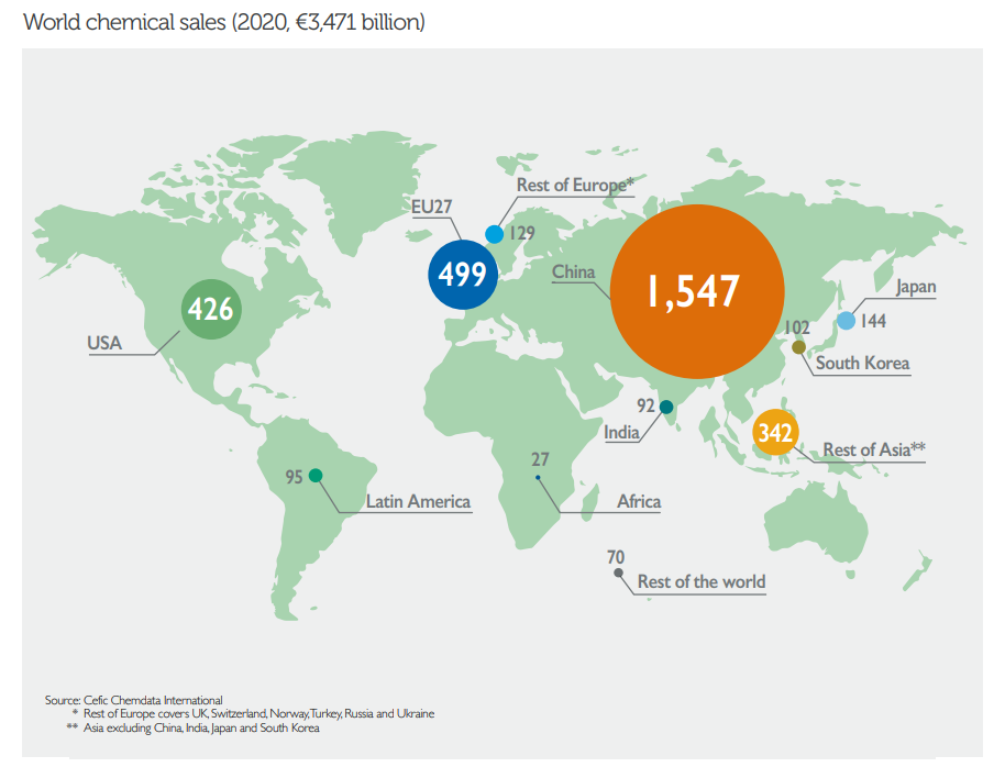 据了解,欧洲是仅次于中国的全球化工行业重要的生产基地,在2020年,世界化学品销售额估值为34710亿欧元,而整个欧洲市场的化学品销售额估值高达6280亿欧元,占全球市场的18%。