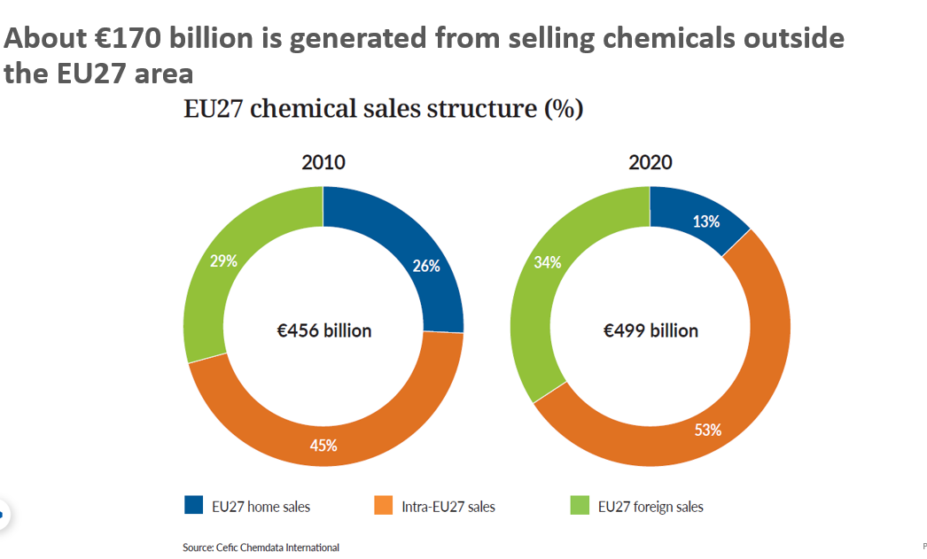 根据欧洲化学理事会最新发布的数据显示,2020年,欧盟27国的化学品销售收入来源分布中,欧盟国内市场占比13%,欧盟内部销售(不包括国内收入)占比53%,欧盟对外出口占比34%。通过对比,我们可以看出在这近十年间,欧盟对外出口的占比提高了5个百分点,这也体现了全球贸易的趋势,以及欧盟外市场对于化学品需求的增加。