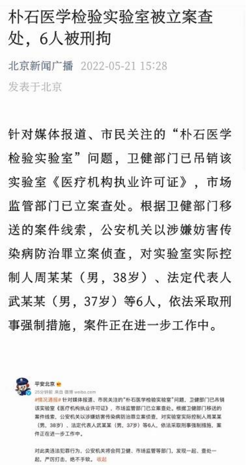 据平安北京微信公众号消息,针对媒体报道、市民关注的“朴石医学检验实验室”问题,卫健部门已吊销该实验室《医疗机构执业许可证》,市场监管部门已立案查处。