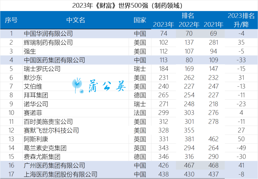 8月2日,2023年《财富》世界500强榜单发布,17家制药公司上榜,其中,4家中国药企榜上有名:中国华润有限公司、中国医药集团有限公司、广州医药集团有限公司、上海医药集团股份有限公司榜上有名。广药集团排名上升最快:广药集团连续第三年上榜,排名年年上升,今年位居第426位,比去年排名跃升41位,已经连续两年在榜且排名稳步上升。 中国医药集团有限公司:113名,比去年下降33名; 上海医药集团股份有限公司:438名,比去年下降了8名。 上榜的跨国公司:第102位,辉瑞;第112位,强生;第184位,罗氏;第231位,默沙东;第240位,艾伯维;第265位,拜耳;第271位,诺华;第299位,赛诺菲;第312位,百时美施贵宝;第328位,赛默飞;第331位,阿斯利康;第343位,葛兰素史克;第346位 费森尤斯。辉瑞,成为全球最大的制药公司:辉瑞制药有限公司排名上升35位至第102位,成为全球最大的制药公司,利润为31,372百万美元。中美差距明显:以辉瑞为代表的10家美国制药企业,平均销售收入982亿美元,平均利润114亿美元。上榜中国企业中被纳入药企行业只有中国医药和广州医药两家企业。这两家企业平均销售收入647亿美元,平均利润7.1亿美元。两项指标远远低于美国企业。利润如此之低,企业难以投入足够资金用于创新。生物医药行业是关系人类未来发展的行业。上榜中国企业与美国企业的差距表明,我们还有很长的路要走。