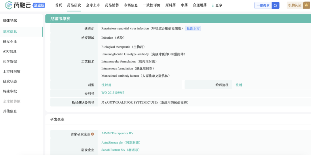 Nirsevimab相关专利:WO-2015108967。最早由荷兰AIMM Therapeutics BV开发;于2012年授权予MedImmune/阿斯利康。2017年3月,赛诺菲Pasteur与MedImmune/阿斯利康达成共同合作开发协议。