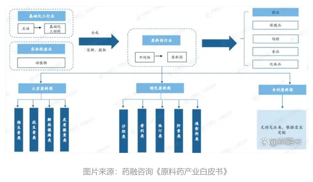 原料药产业链涵盖了上游的基础化工和农林牧渔业,主要包括基础化工、植物种植、动物养殖和部分医药中间体制备等;中游的原料药生产,即通过化学合成、动植物提取、微生物发酵或其他现代生物技术等制备得到原料药;以及下游的化学制剂生产等多个环节。