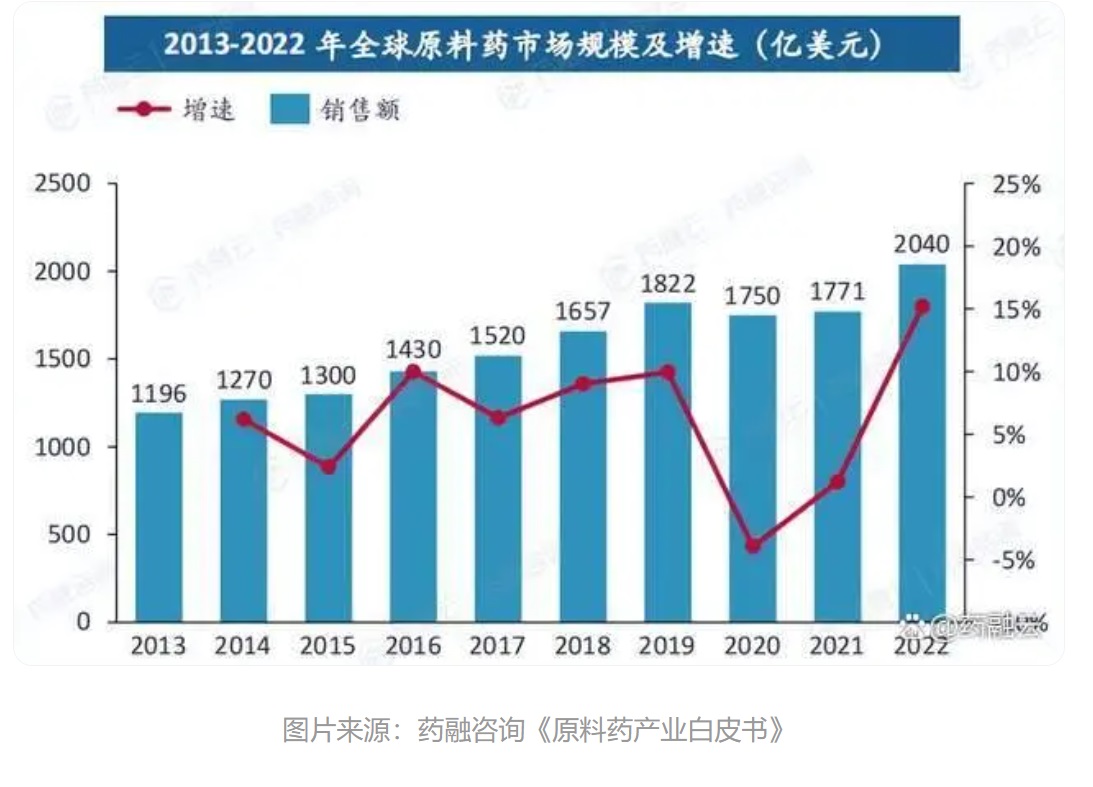 从全球范围来看,原料药市场在经历了2020年新冠疫情的冲击后逐渐恢复增长。全球原料药市场规模在2020年受新冠肺炎疫情影响与2019年相比有所下滑,从1822亿美元降至1750亿美元,下降3.95%;但很快,市场从2021年开始便恢复了增长,2022年全球原料药市场规模达到2040亿美元。