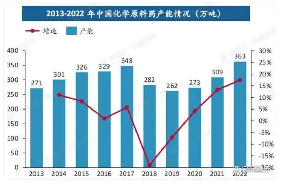 国内原料药市场也呈现出相似的趋势。在2013-2017年间中国原料药的产能整体呈增长趋势;但在2018-2019年受环保安全监管趋严以及供给改革不断深化的影响,一些高能耗、高污染、工艺技术落后、过剩的原料药产能被淘汰,中国原料药产能下降明显;2020年我国原料药市场开始恢复增长,但受疫情影响,增长缓慢,增速仅约为4.2%;从2021年开始增长速度加快,相比2020年增速约为13.2%;2022年中国原料药产能已超过了2017年时最高产能,相比2021年增速约为17.5%。
