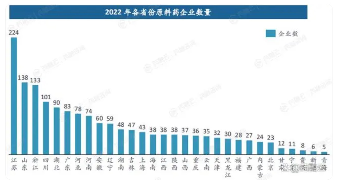 其中,企业数>100家的有4省,分别为江苏(224家)、山东(138家)、浙江(133家)、四川(101家),4省合计占全国原料药企业总数的近四成(37%)。